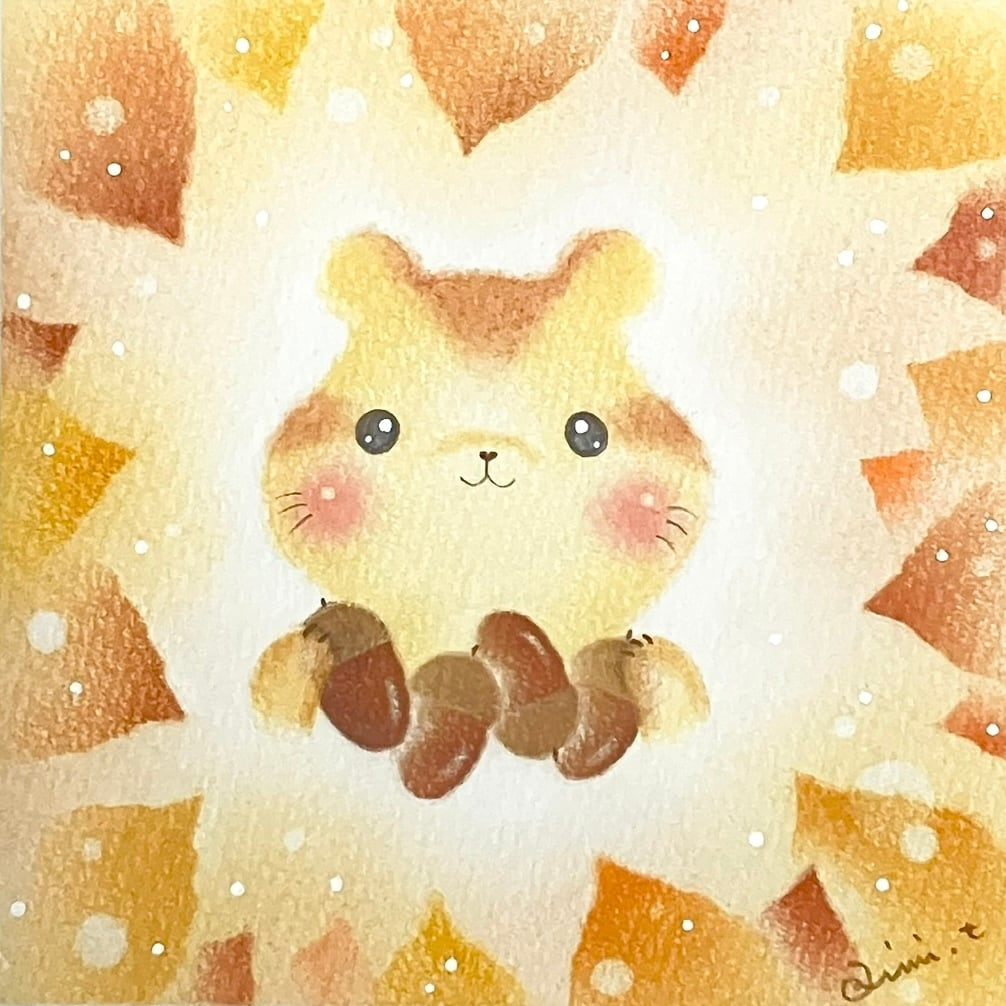 りささんが落ち葉に囲まれた優しくあたたかみのあるパステルアート