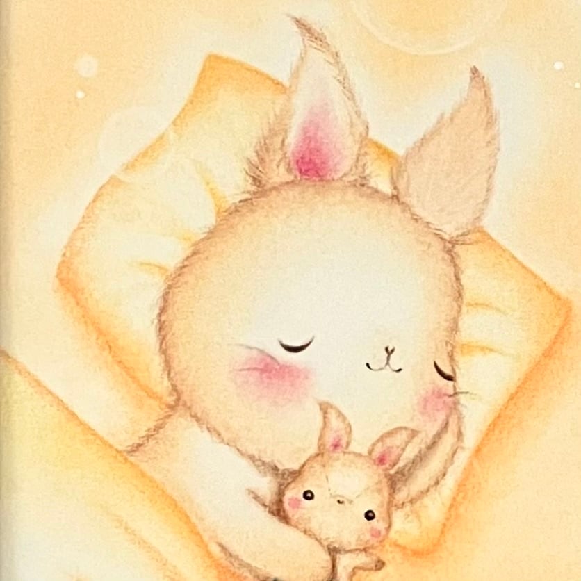 うさぎさんがぬいぐるみと一緒に眠っている心温まるアート。