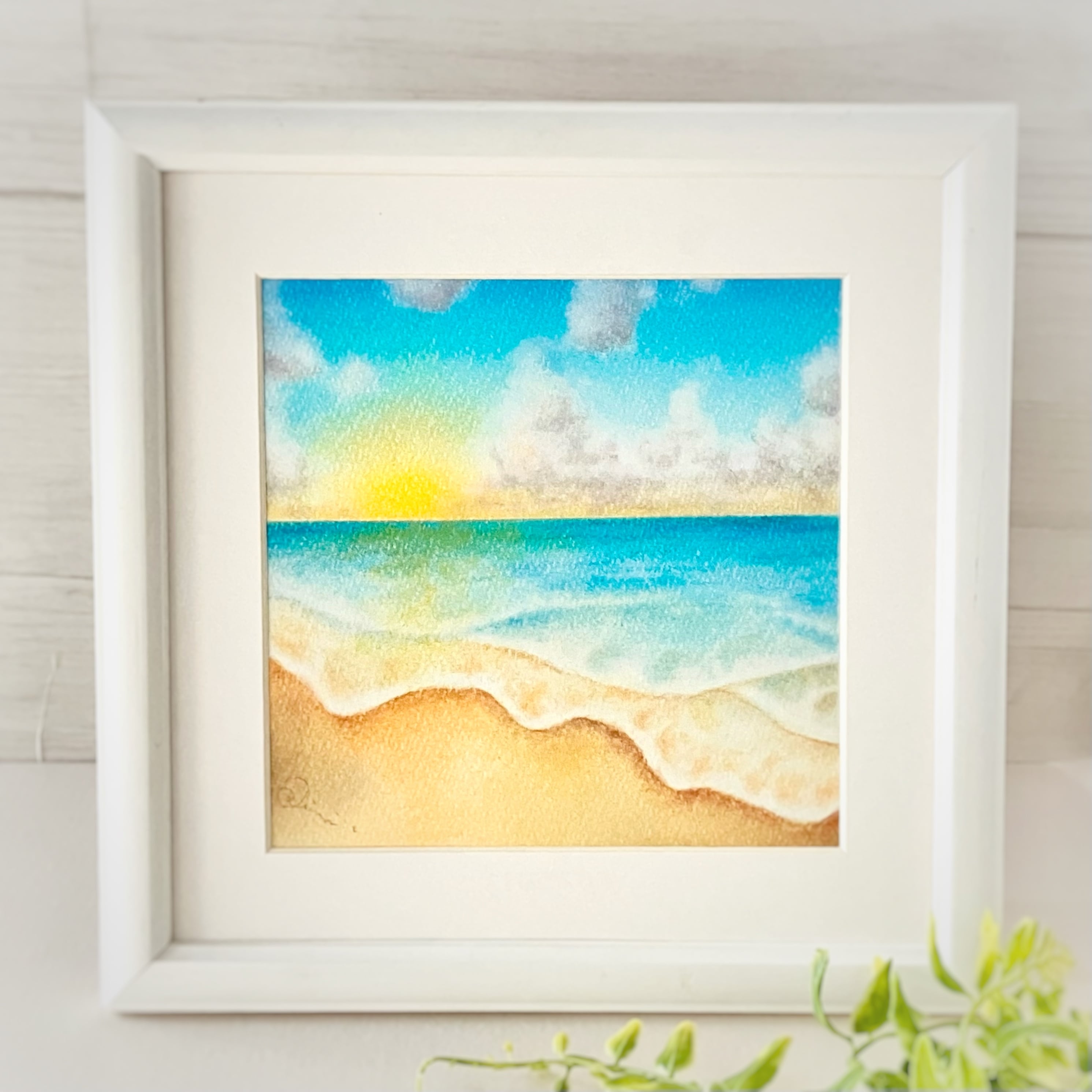 雲が散らばる空に砂浜に押し寄せる波…一瞬の光景を、柔らかくも力強いタッチで描きました。
