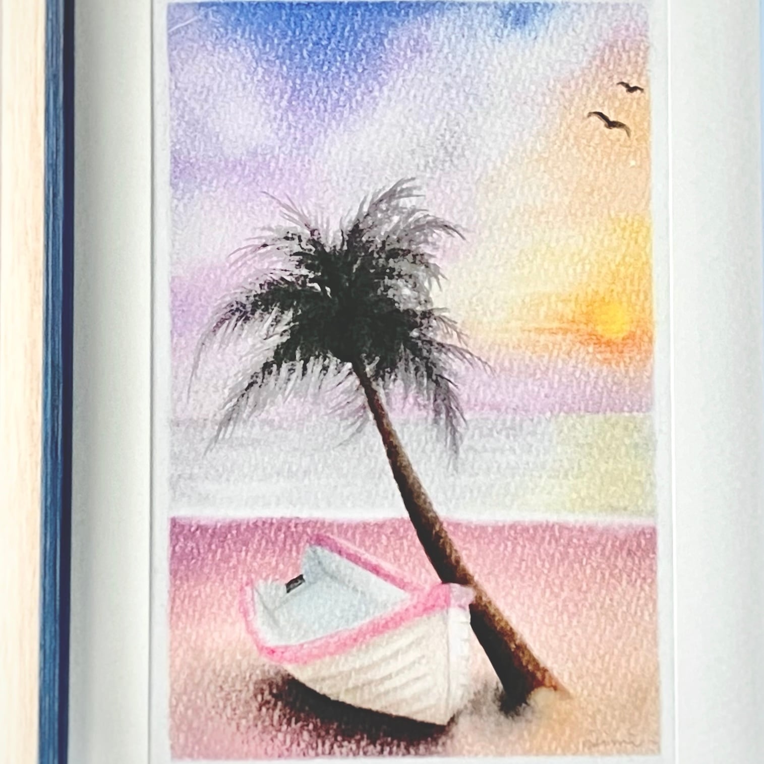 波の音だけが響く中、時を経た小さなボートと椰子の木が寄り添うように佇んでいます。