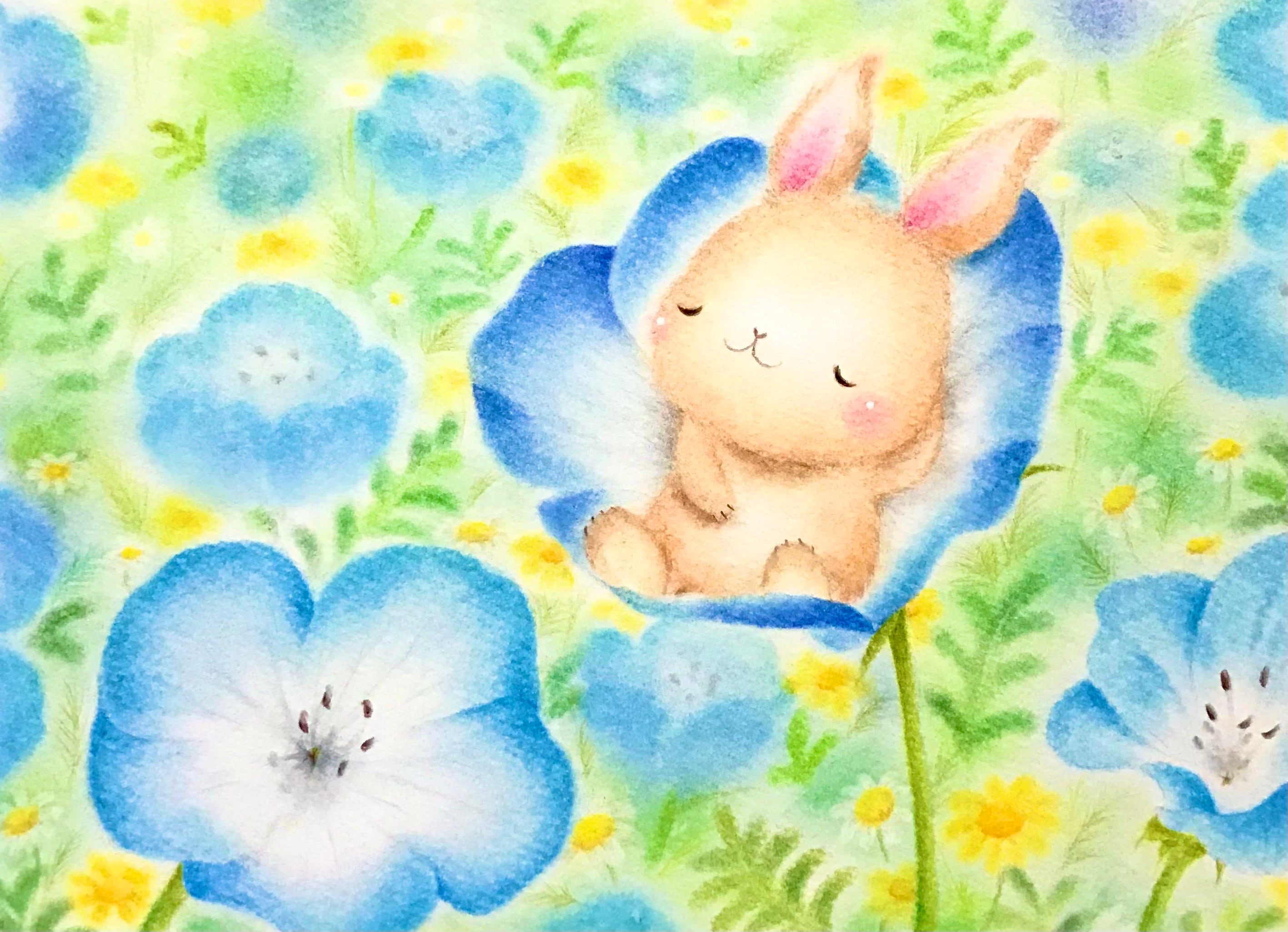 ネモフィラの中ですやすや気持ちよさそうに眠るうさぎさんを描いたファンタジーな世界観のパステルアートです。